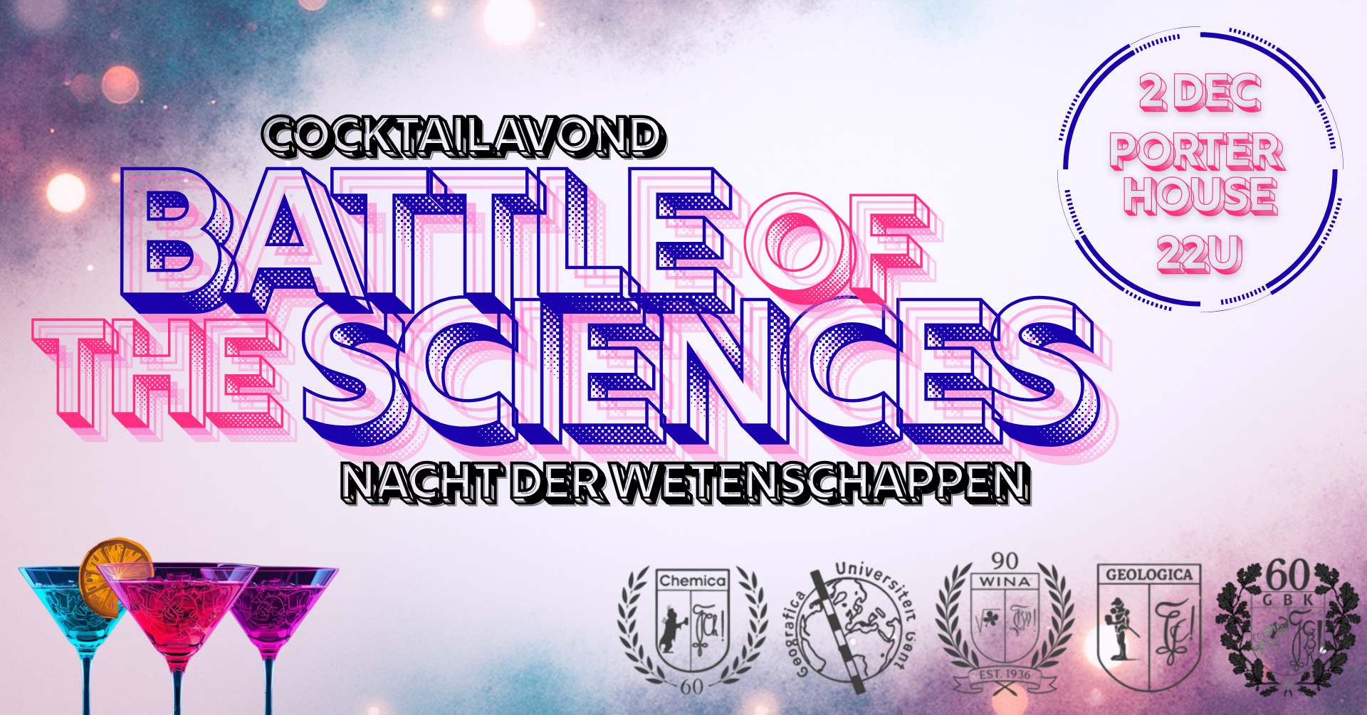 Tijd om dat definitief te beslissen. We doen dat niet via sport, niet via een quiz en al helemaal niet via karaokegeluidsterreur. We pakken uit met onze geweldige samenwerking: de Nacht der Wetenschappen: Battle of the Sciences! Tijdens deze avond kan je naar hartenlust cocktails bestellen en elke bestelling telt als score voor de vereniging waarvoor jij drinkt. Haal dus álle mensen uit jouw richting mee en drink de anderen speels, charmant en met stijl naar de vergetelheid.