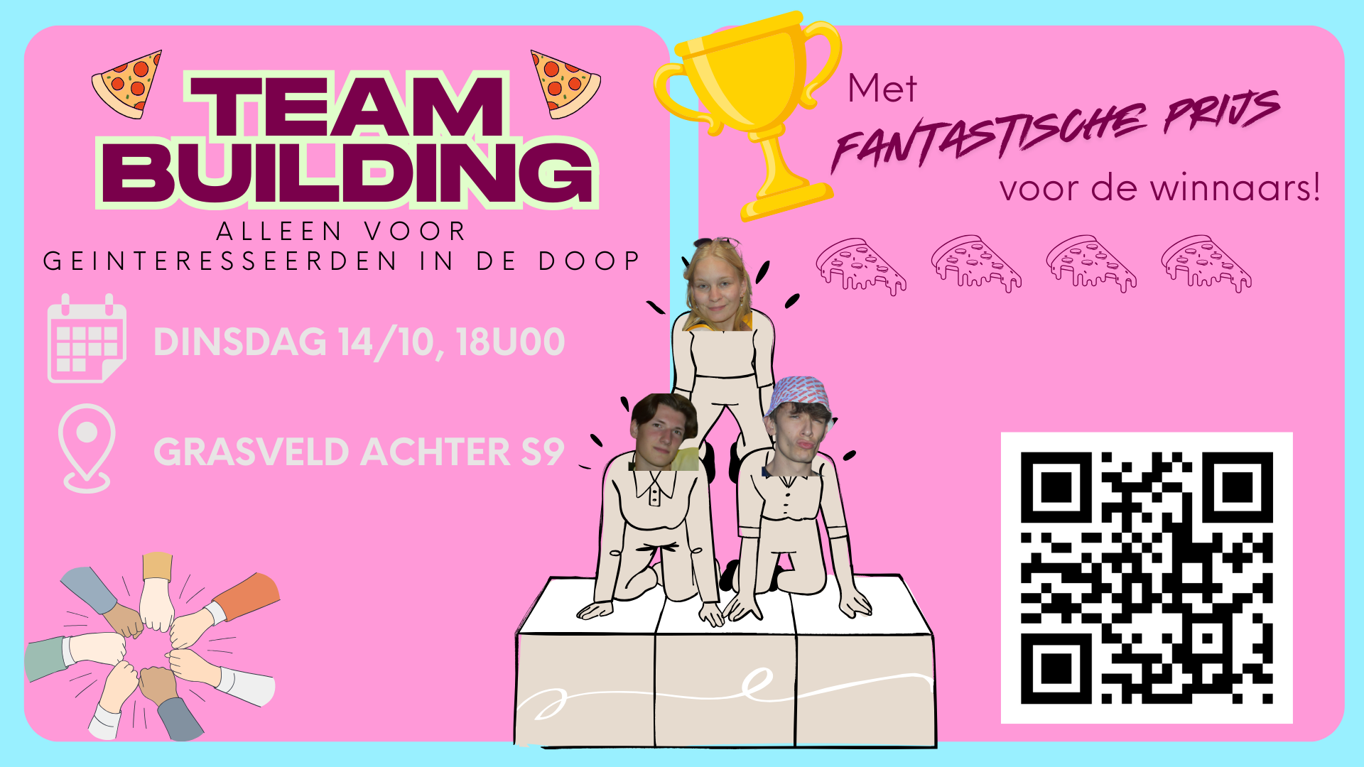 Om 18.00u verwachten we jullie aan de inkom van S9 voor dik twee uurtjes plezier. Aan de hand van een mega leuk spel waarin je je helemaal kan opleven leren we elkaar beter kennen. We proberen buiten te spelen, kleed je dus warm aan met kleren waarin geravot kan worden.