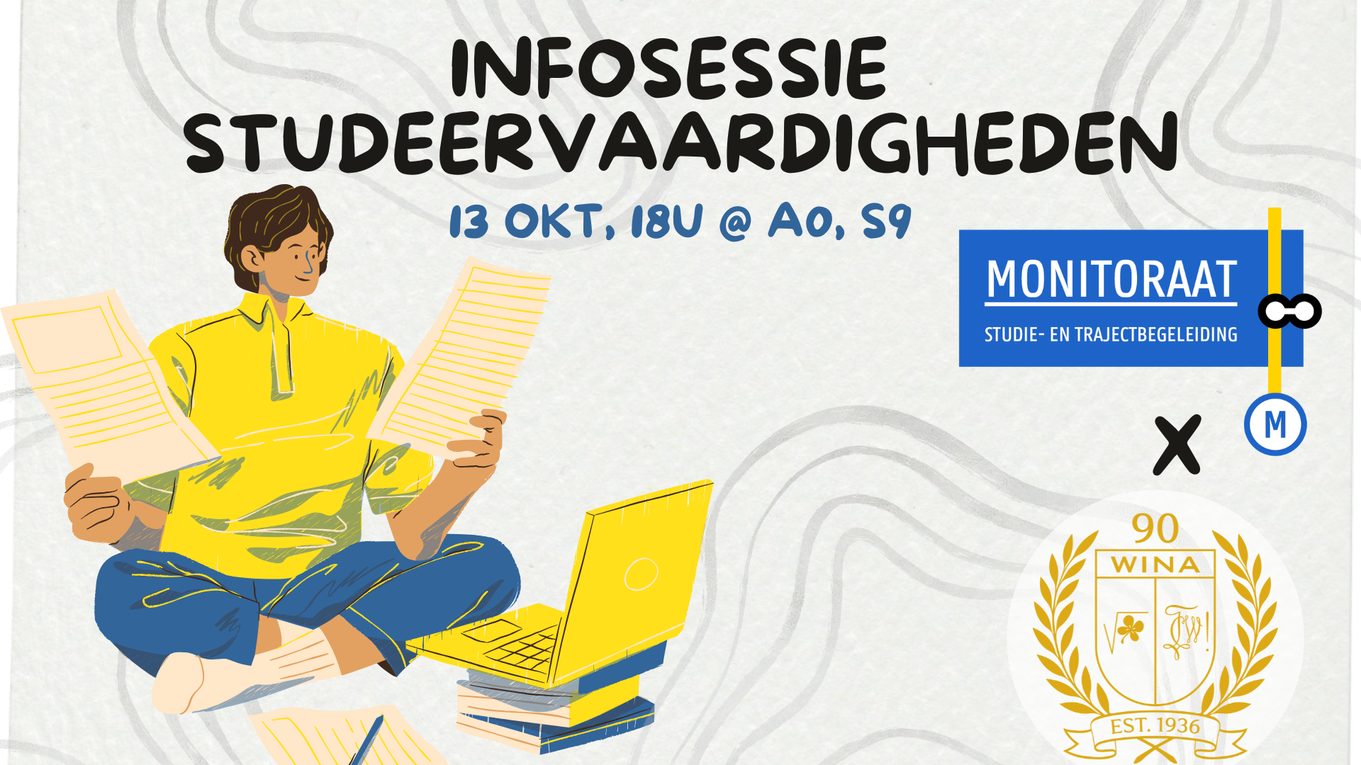 Op maandag 13 oktober om 18u organiseert het monitoraat van de Faculteit Wetenschappen samen met WiNA een eerste sessie rond studeervaardigheden, voor de eerstejaarsstudenten Wiskunde, Informatica en Fysica en Sterrenkunde. Deze sessie zal doorgaan in Auditorium A0 in S9.