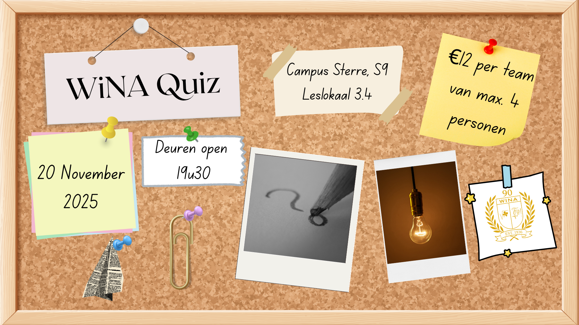 De tijd van het jaar is hier weer, tijd voor de jaarlijkse WiNA-Quiz! Weet jij veel over niet alleen wiskunde, fysica en informatica, maar ook zo veel meer? Win jij onze hoofdprijs, of ben jij beter in zuipen en neem je onze zuipbeker mee naar huis? De zuipbeker gaat naar het team dat op het einde van de quiz het meeste drank op heeft! Zelfs voor mensen die iets minder quizervaring hebben, valt er iets te winnen, want er vallen tal van prijzen te winnen!