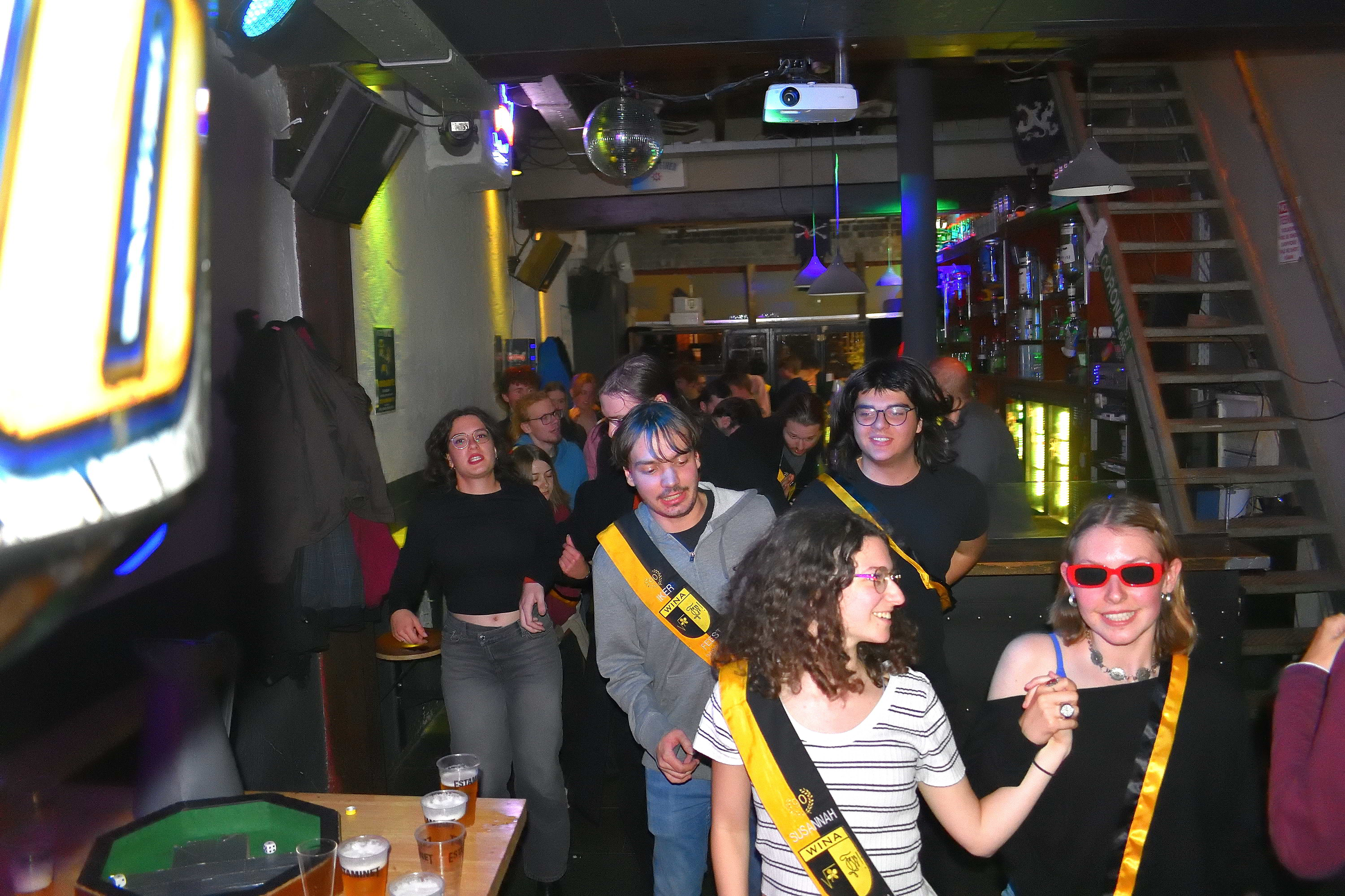 De eerste clubavond, wat een feest is dat toch altijd! Een drukte van jewelste, nieuwe gezichtjes, oude zakken die nog eens langskomen, blij weerzien, nieuwe ontmoetingen, en natuurlijk een gratis vat. Met goeie muziek stond iedereen meteen op de dansvloer, en deze foto is daar het perfecte bewijs van.