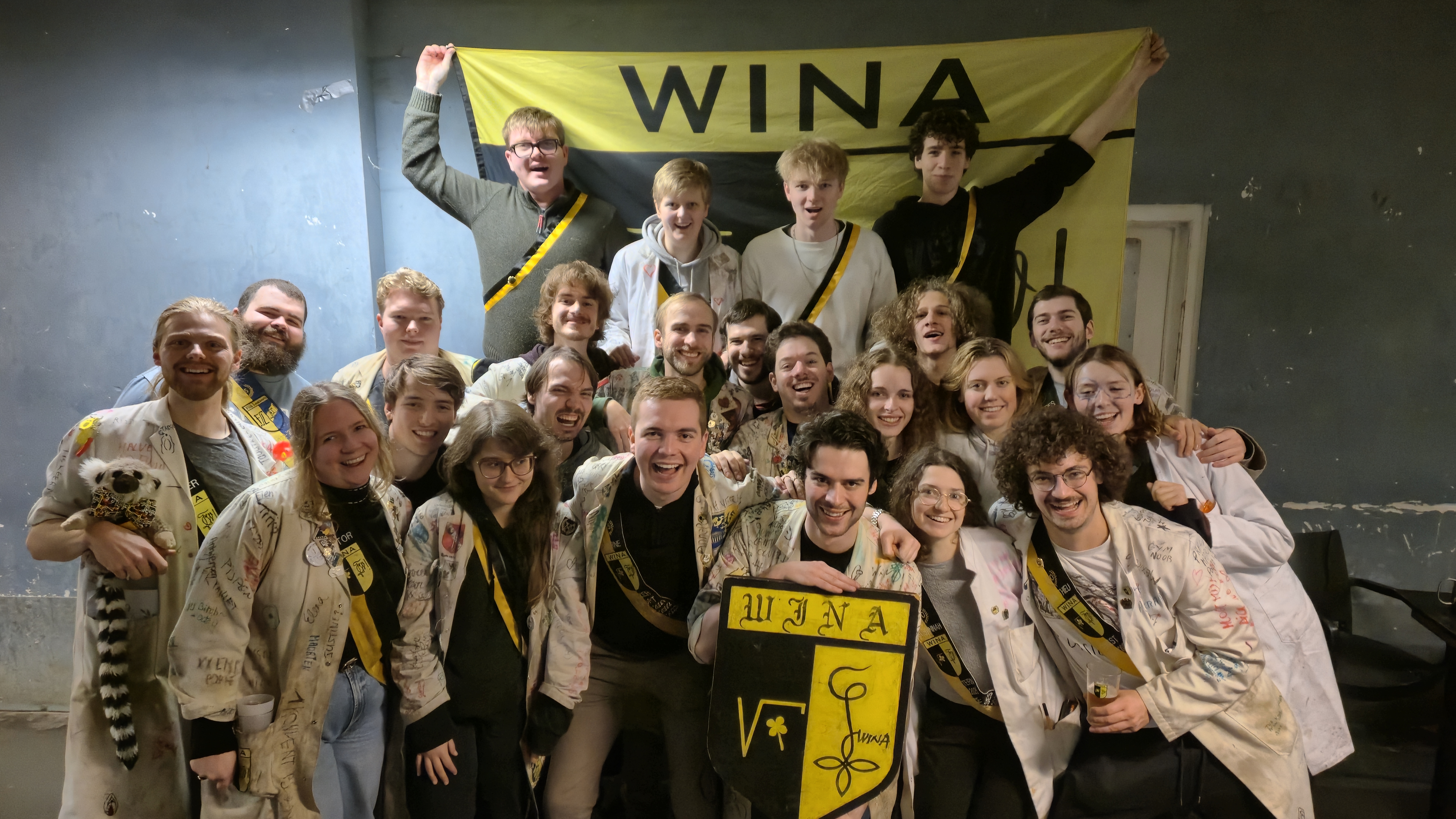 Vlak na de finish van onze 24 uren cantus werd deze iconische groepsfoto getrokken. Hier staat iedereen die de volledige 24 uur heeft gecantust. Ja, dat zie je ook! Moe, uitgeput, maar met een glimlach van oor tot oor staan ze er trots op. Van de eerste slok tot het laatste refrein trotseerden deze kanjers elke ad fundum, genoten van de speciale lustrumdrankjes en hapjes, en maakten van de cantus een onvergetelijk feest. Een foto vol doorzettingskracht, overwinning én een klein beetje chaos. Een herinnering die ons nog lang bij zal blijven!