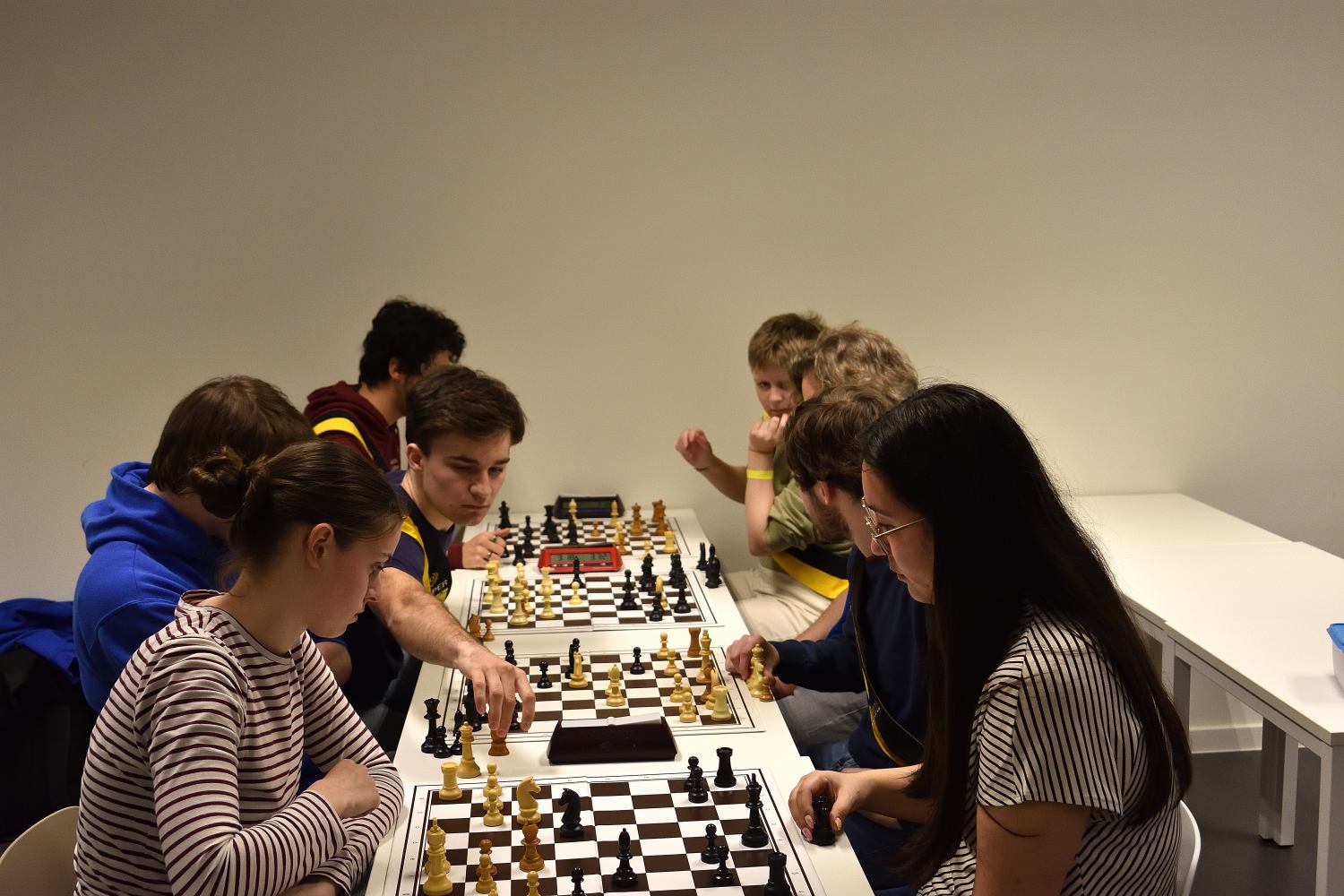 Dinsdagavond stond helemaal in het teken van schaken. Voor wie mij een beetje kent, zal het dan ook niet verbazen dat de foto van deze week uit die avond komt. We waren met vier borden en in totaal acht mensen een potje doorgeef aan het spelen, wat op zich al genoeg zegt over de lichte chaos die daarbij komt kijken. Terwijl de klokken bleven tikken en de stukken vlot van bord tot bord verhuisden, probeerde iedereen het hoofd koel te houden en toch nog ergens een degelijke zet te vinden. Het resultaat: veel gelach, hier en daar een geniale ingeving (of een complete blunder) en vooral een supergezellige avond.